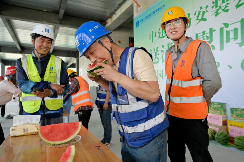 6月16日,在北京市经开区的中建二局安装公司信创园项目举办的夏送清凉慰问活动上,建筑工人在吃西瓜。新华社记者 才扬 摄
