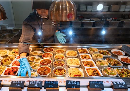 2025年11月18日,四川博物院食堂工作人员布置小碗菜。