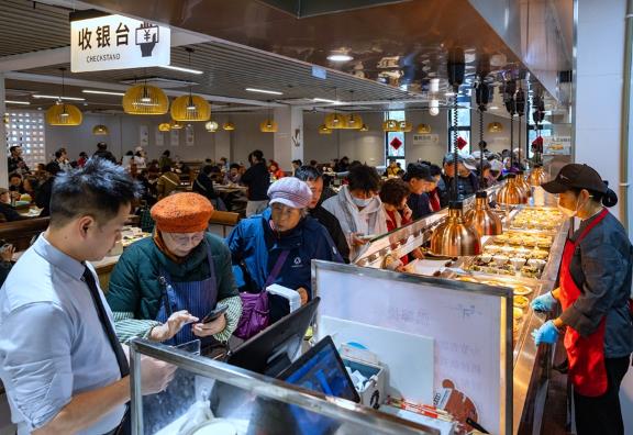 2025年11月18日,游客们在四川博物院食堂内排队选菜。